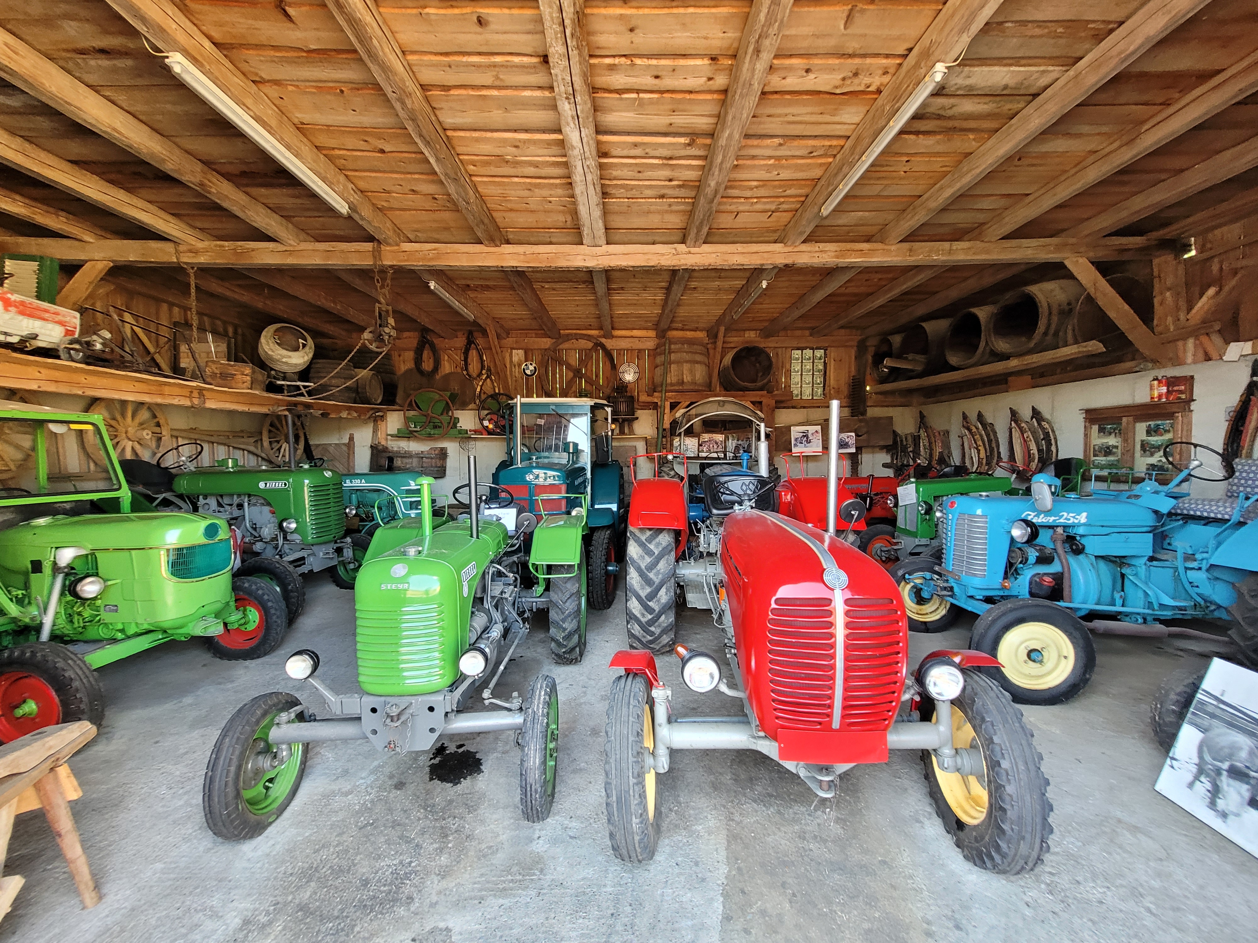 große Sammlung an landwirtschaftlichen Geräten und Traktoren,